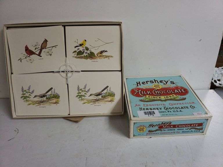 Bird-themed notecards housed in a Hershey's Milk Chocolate box. The box features Hershey Chocolate Co. branding and vintage-inspired design. Includes illustrations of cardinals, goldfinches, and other birds.
