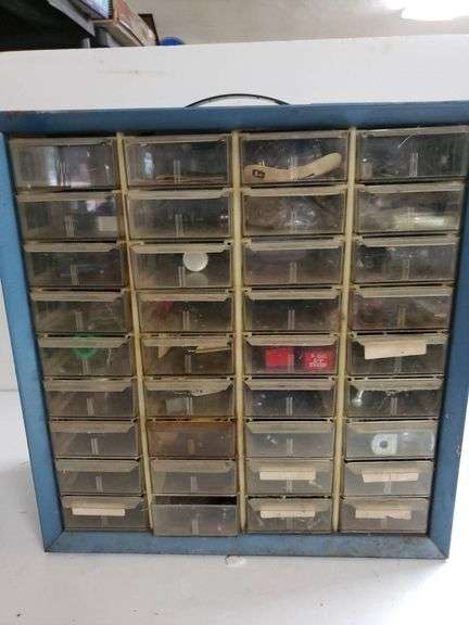 Small metal storage cabinet featuring multiple transparent plastic drawers, each containing assorted small items and hardware. Includes a carrying handle and compact design.