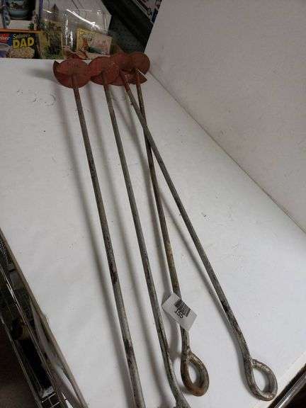 4 earth auger stakes featuring red blade attachments and looped ends. Made from metal and suitable for drilling into the ground. Includes a ruler in images for scale reference.