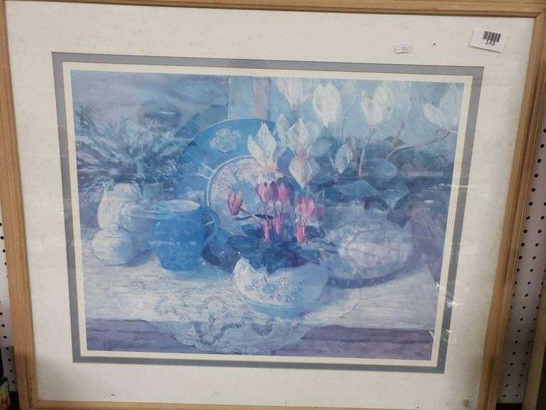 Framed artwork depicting a floral still life scene featuring pink flowers, potted plants, and blue and white dishware. The frame dimensions are 34 inches by 30 inches.