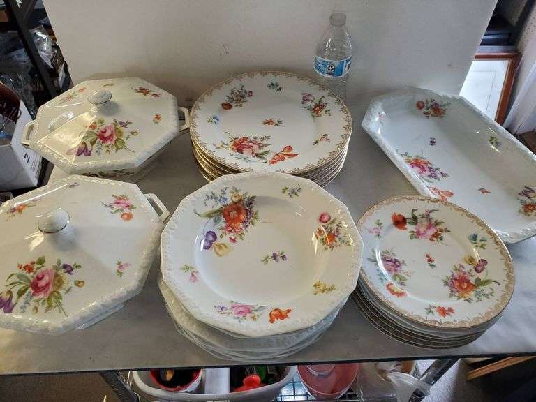 A porcelain dish set showcasing vibrant floral patterns, including plates, platters, and lidded serving dishes. Distinct markings indicate 'Rosenthal,' 'Maria,' and other details. Includes (2) (2) (6) (5) (2) (6).