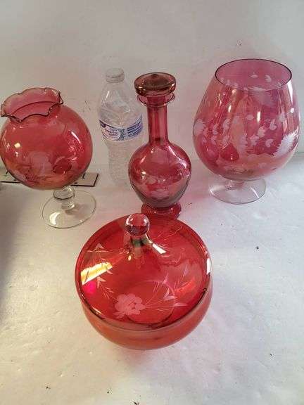 Red glass items featuring floral etchings, including a lidded dish, a small vase, a goblet-style piece, and a large bowl-shaped glass item. Decorative accents enhance each piece.