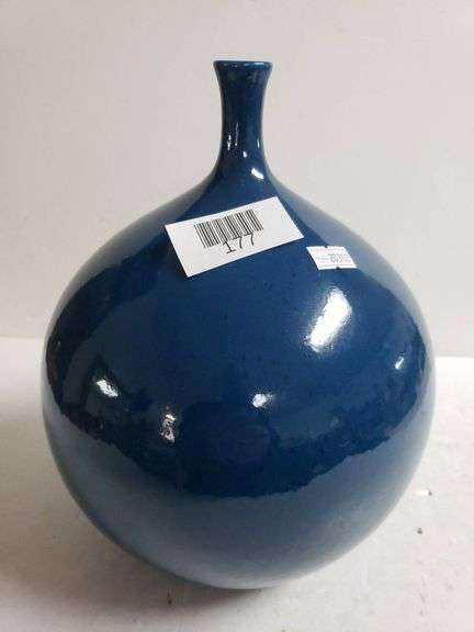 Blue ceramic vase with a glossy finish and a narrow neck, labeled as Crate & Barrel and made in Portugal. The vase features a clean, spherical design and includes an original label on its base.