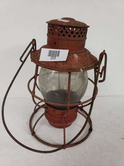 A metal lantern featuring a perforated top, glass globe, and wired structure. Includes an attached handle for carrying or hanging. Notable for its rustic design and construction.