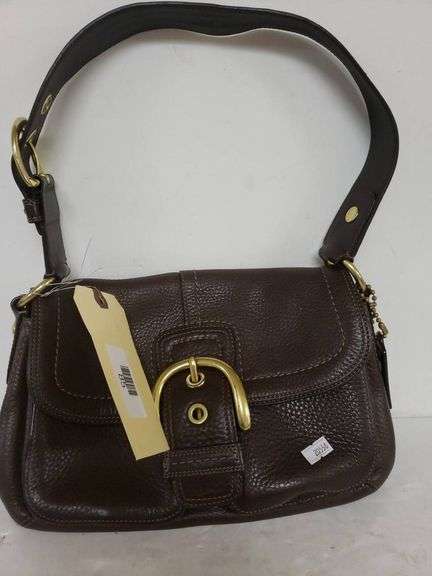 Authentic brown Coach handbag featuring gold-tone hardware and a secure buckle closure. Includes an adjustable strap and a spacious interior with multiple compartments for convenience.