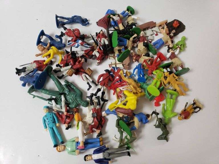 Plastic figurines featuring a variety of designs including soldiers and other characters. Includes a mix of colors, poses, and details.