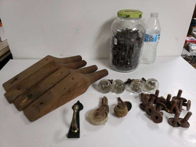 Hardware lot featuring threaded wooden pieces, a large jar of nails, glass knobs, rusty fasteners, and various other items. Includes individual hardware components like rollers and handles.