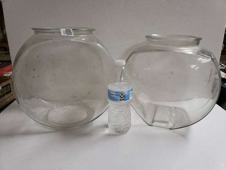 2 clear glass containers, each with a unique fish bowl-style design. One features a traditional round shape, and the other has a distinctive panelled square shape. Suitable for various uses or display.
