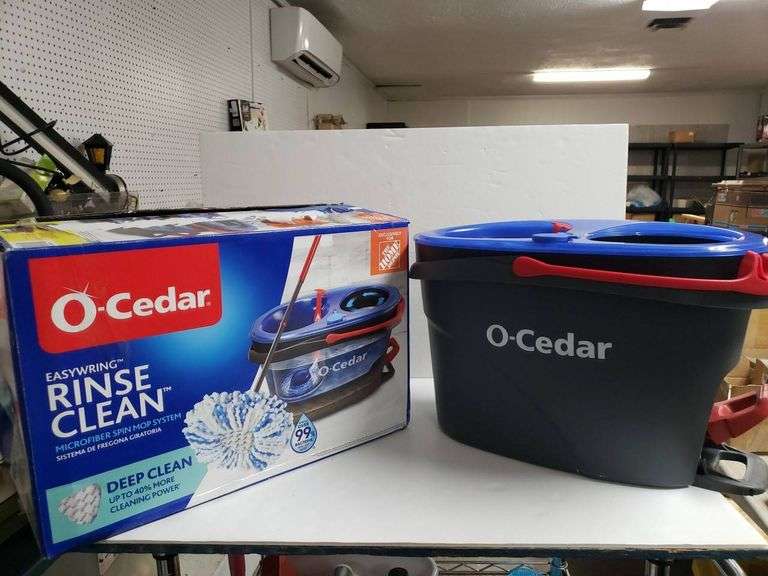 O-Cedar EasyWring Rinse Clean Microfiber Spin Mop System includes bucket and mop head but is missing the mop handle. Features dual chambers for clean and dirty water separation.