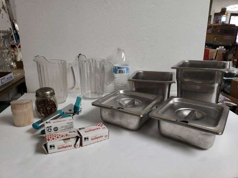 Includes multiple stainless steel containers with lids, plastic pitchers, a jar with contents, packs of toothpicks, and two handheld openers. Suitable for various kitchen or catering uses.