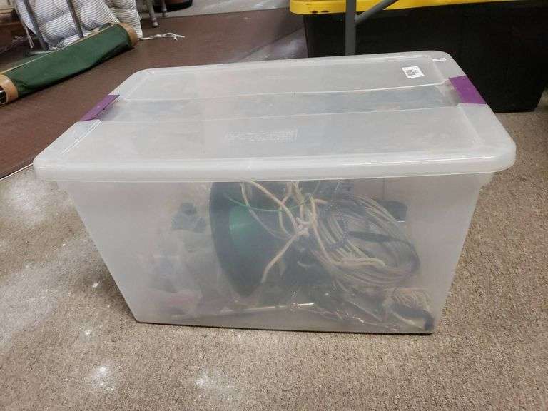 Clear plastic storage bin containing an assortment of cables, wires, and supplies. Contents include spools of wire, bungee cords, and various accessories in plastic bags.