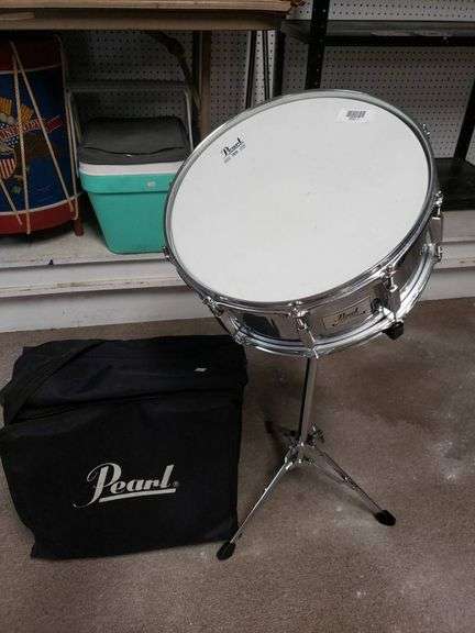 Pearl brand snare drum with a steel shell. Includes a matching stand and a Pearl-branded carrying bag. Stamped 'Made in Taiwan' on the shell, and bag features a zipper closure.