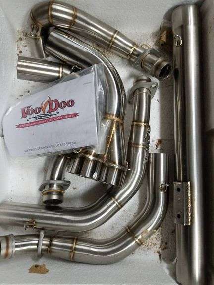 VooDoo Sidewinder custom exhaust system designed for motorcycles. Includes multiple components and parts as shown, along with original packaging and labeled instructions.