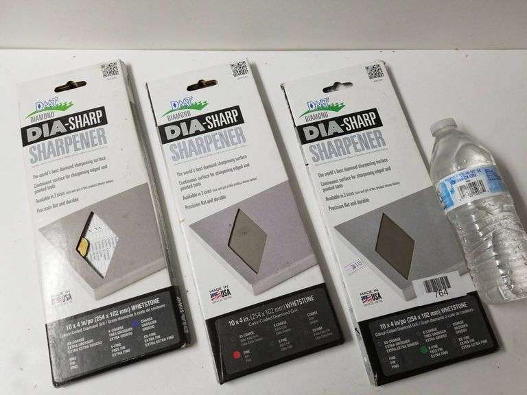 Coarse, fine, and extra-fine grit sharpeners. Each measures 10 x 4 in. (254 x 102 mm) and is designed for precision sharpening. Made in the USA since 1976.