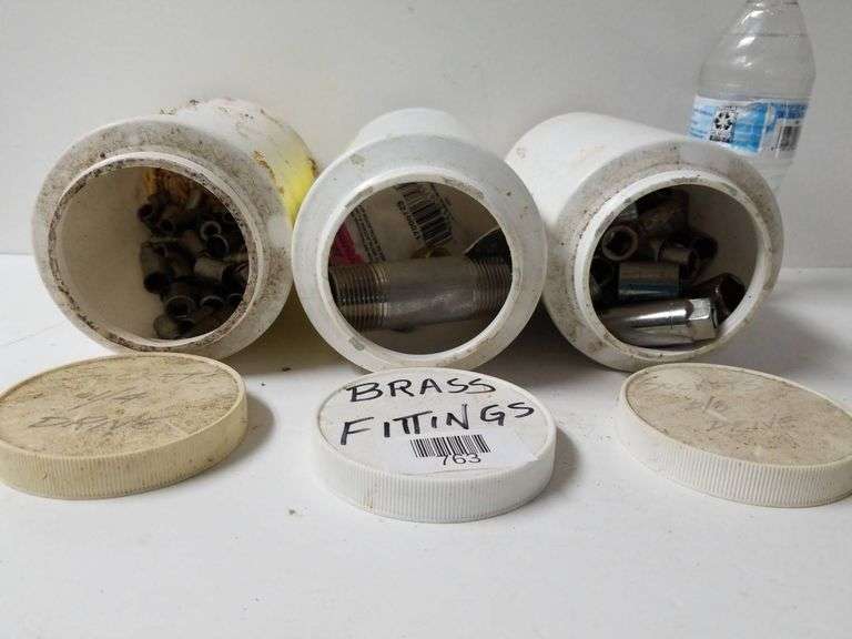 Brass fittings and drive sockets stored in three labeled containers. Labels include 'Brass Fittings,' 'Sockets 1/4 Drive,' and 'Sockets 3/8 Drive.' Items and quantities within each container vary.