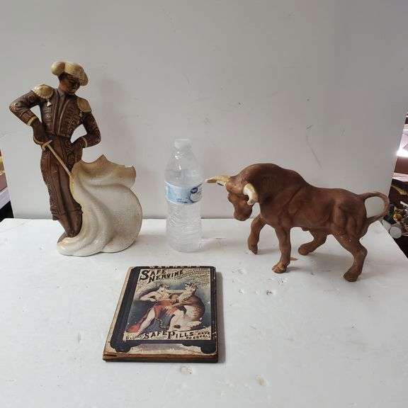LOT 161 - Porcelain Like Bull Statue, Warner's Safe Nervine Sign, And Porcelain Like Matador Statue