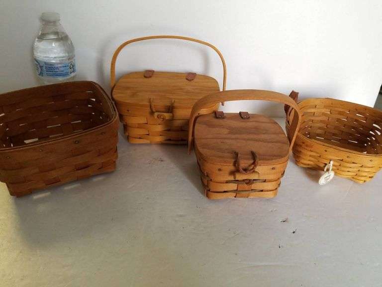 4 Longaberger handwoven baskets, made in Dresden, Ohio, USA. Includes baskets dated 1994, 2000, 2005, and an undated piece. Each basket features distinct details, handles, and functional design.