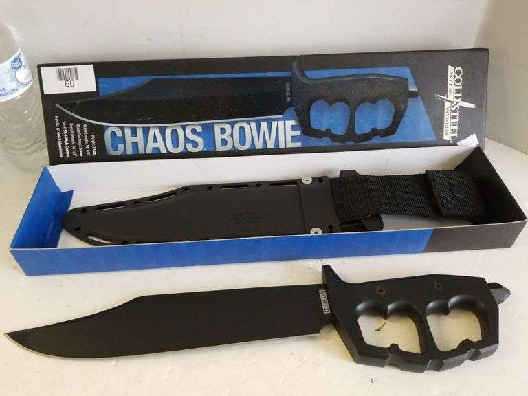 Cold Steel Chaos Bowie knife featuring a 10 1/2-inch SK-5 high carbon steel blade, a 6-inch 6061 aluminum handle, and a sheath made of Secure-Ex. Includes original packaging.