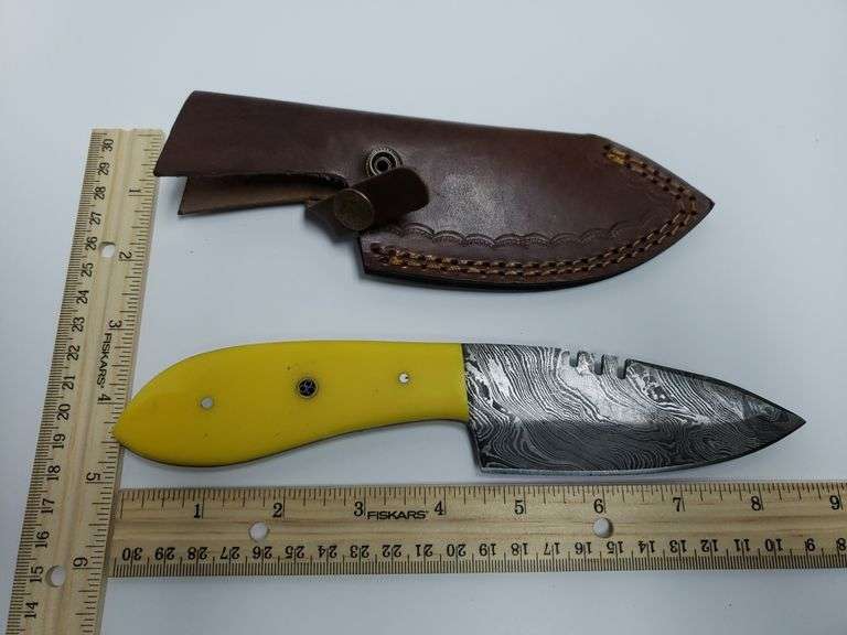 LOT 863 - Damascus Steel Knife W/custom Handle & Sheath - 8.75" Long - Yellow Handle