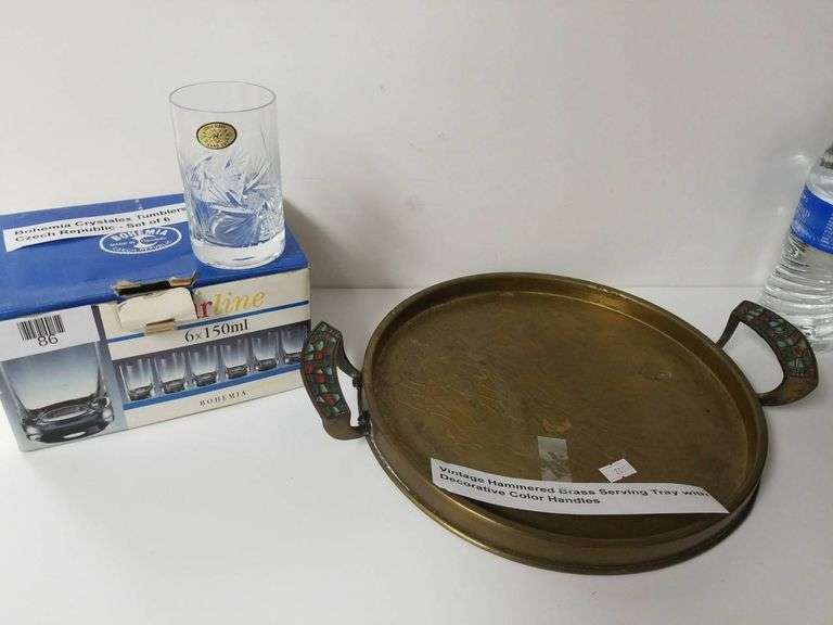 Includes a round hammered brass serving tray with decorative color handles and a set of 6 Bohemia Crystalex tumblers (150ml each). Tumblers are made in the Czech Republic and come in original packaging.