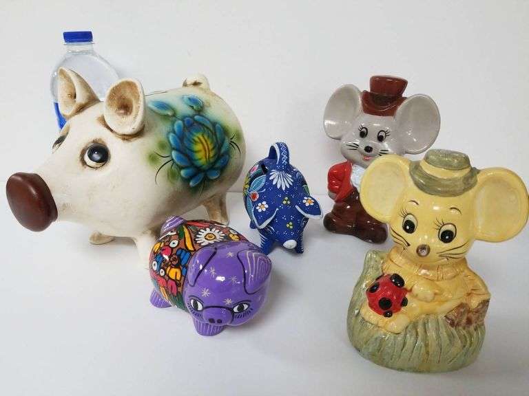 Ceramic items including a large flower-decorated piggy bank, two handpainted Mexican pottery pig banks, and two mouse figurines. Each features unique painted details, with origins marked on some of the pieces.