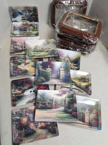 12 decorative plates from Thomas Kinkade's Nature's Retreat series, dated 1999. Each plate includes a certificate of authenticity. Comes with matching display frames.