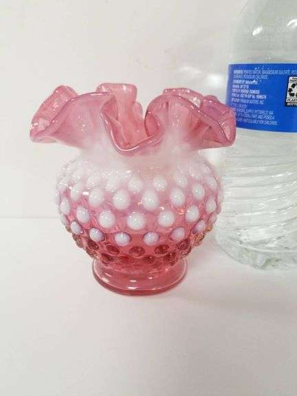 Fenton hobnail vase with a double crimp ruffle design in cranberry opalescent glass. The vase is 4.5 inches tall, making it an elegant decorative item.