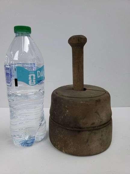 Butter press featuring a carved floral design on the base and a handle for pressing. The item is crafted with visible details and a sturdy handle for functional use.