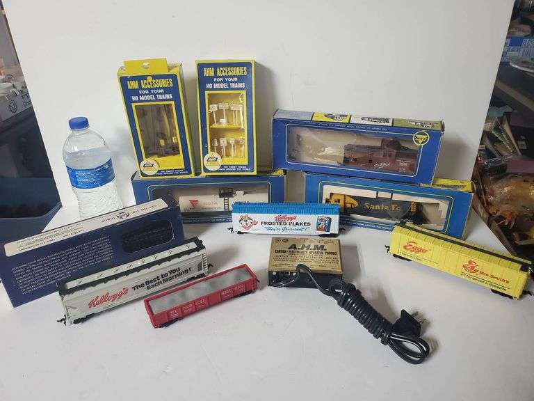 Assortment includes HO scale model train cars, such as Kellogg’s Frosted Flakes, Santa Fe, and others, along with AMM accessories for model trains. Includes an AHM hobby transformer model 899V.