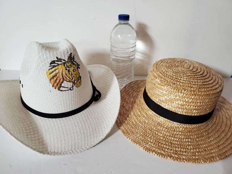 Children's hats including one white Western-style hat with a horse graphic by Western Express Inc. and one straw round-brim hat with a black ribbon band.