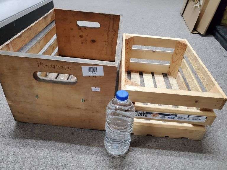 Two rectangular slatted crates. Both feature cutout handles on the sides for easy carrying. Crates vary in size and are stacked together in one image for scale comparison with a water bottle.