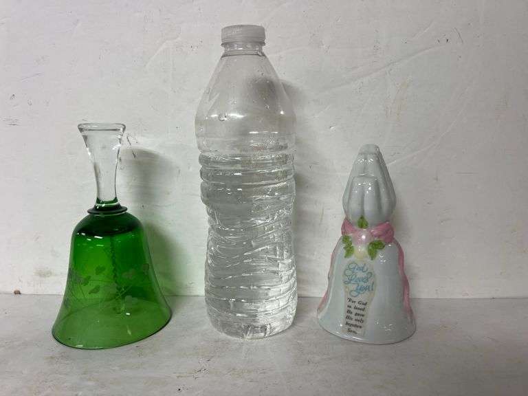 LOT 56 - Vintage Duiske Irish Green Glass Bell & Praying Hands Bell