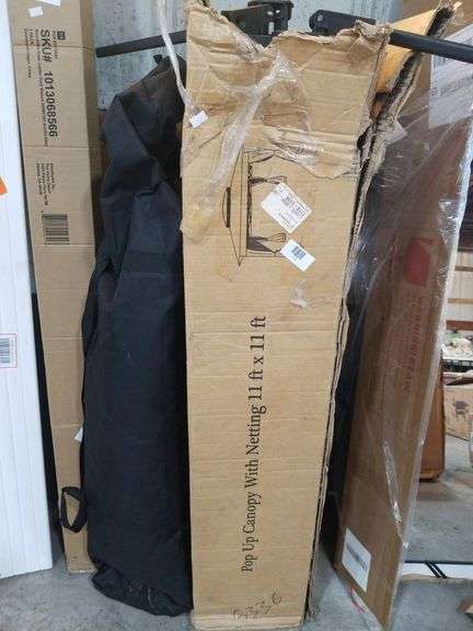 Pop-up canopy measuring 11 ft x 11 ft, including netting, as indicated on the box. Comes with components visible in box and carrying bag. Suitable for outdoor use.