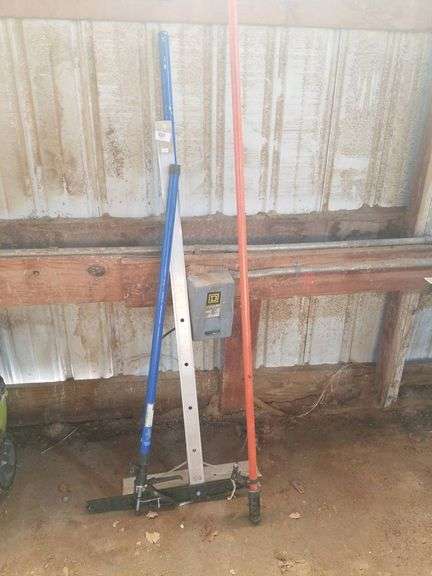 A 2-in-1 support cargo bar and a floor squeegee with aluminum handle. Orange and blue tools with adjustable features. Suitable for use with heavy loads or surface cleaning.