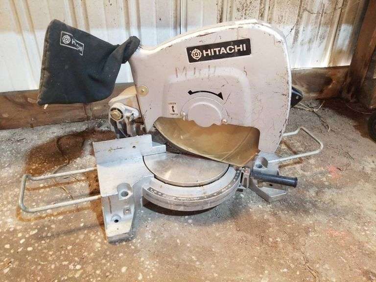 Hitachi C15FB 15-inch miter saw featuring a powerful 1800W, 15A motor and equipped with a dust collection bag. Includes a stable base and protractor scale for precise cutting applications.