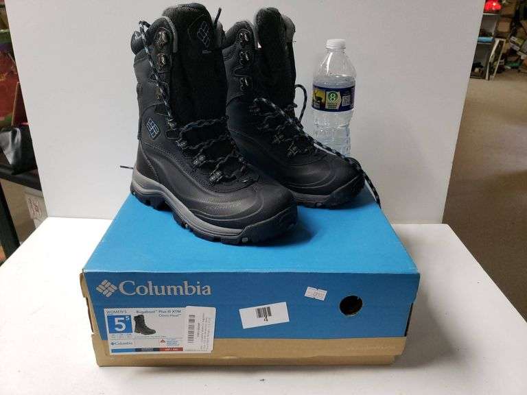 Columbia Bugaboot Plus III XTM Omni-Heat boots in women's size 5.5. Designed for extreme cold with a rating of -65F/-54C. Features include waterproof construction and insulation for warmth and durability.