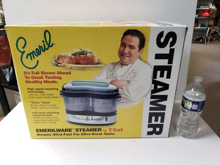 Emerilware Steamer by T-Fal designed for healthy and fast steaming. Box includes a high-capacity steaming unit and user instructions. Item appears new in its original packaging.