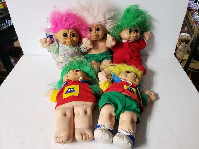 5 dolls featuring bright hair in pink, green, white, and yellow. Plush bodies dressed in various outfits, including red and green attire with printed designs. Approximate size shown against a water bottle.