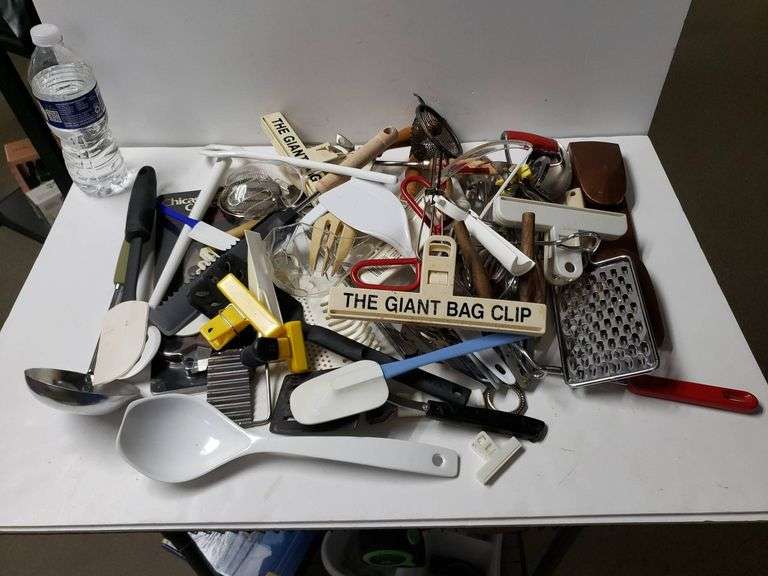 A variety of kitchen utensils, such as spatulas, brushes, graters, scoops, bag clips, and strainers. A mix of tools in different styles and materials for various kitchen tasks.