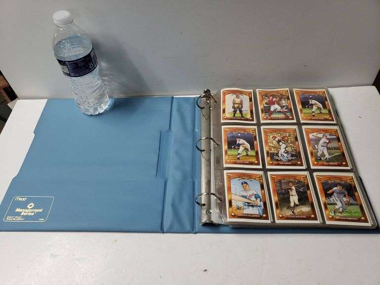 Binder containing a collection of assorted baseball player cards organized in plastic sleeves, featuring various players and sets. Cards include player statistics and images.