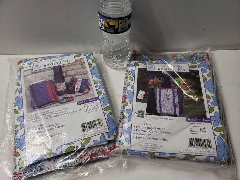 Two sewing kits: Tote Trio Sewing Kit for creating three totes and Weekender Bag Sewing Kit for a larger bag. Each kit includes printed bag stabilizer, premium cotton fabrics, instructions, and sew-along video links.