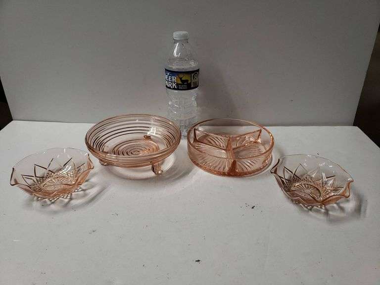 Pink glass serving and decorative dishes including a ribbed circular bowl, a divided round dish, and dishes with intricate geometric patterns. Some pieces feature manufacturer's marking on the base.
