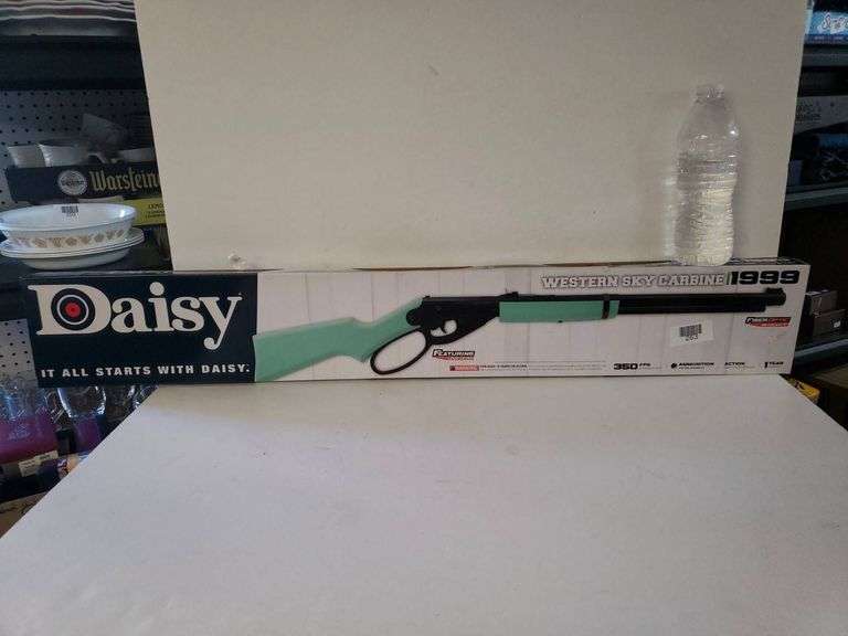 Daisy Western Sky Carbine 1999 lever-action air gun features .177 cal (4.5 mm) BB ammunition, 350 FPS maximum velocity, and a 650-shot capacity. Includes molded stock, adjustable rear sight, and a fiber optic front sight. Overall length approximately 35.4 in.