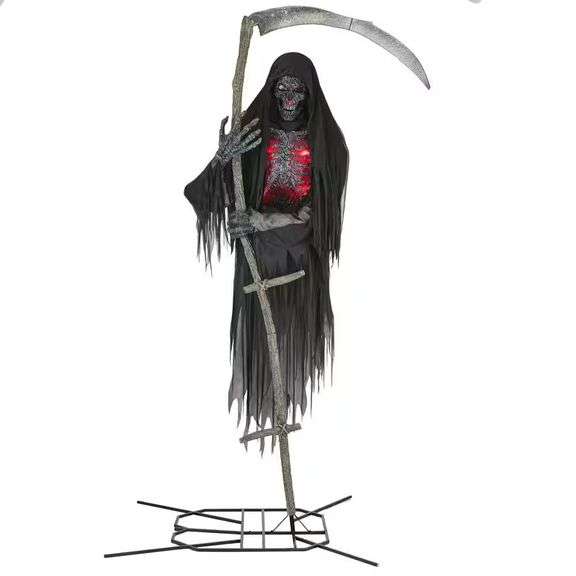 Large 12-foot levitating reaper, distributed by The Home Depot with a case weight of 70.5 lbs. Packaging includes components and instructions for assembly.