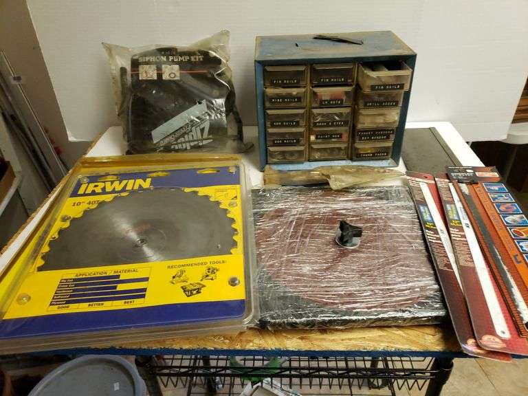 LOT 496 - Tool Organizer, Siphon Pump Kit, Assorted Saw Blades, Hacksaw Blades & More