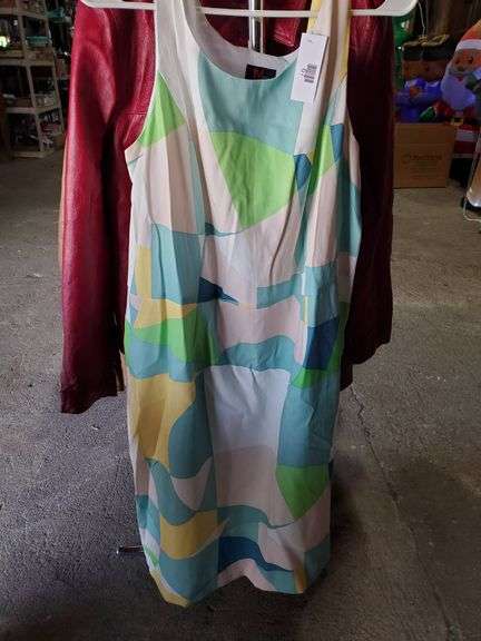 Sleeveless dress labeled JM Studio by John Meyer in size 16. Features a multicolor abstract pattern in white, green, blue, and yellow tones. Made in Vietnam.