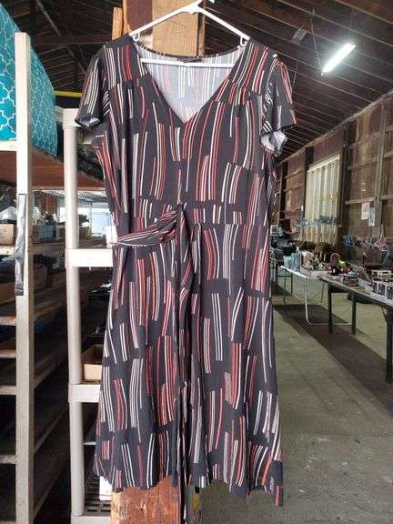 Women's dress by Attention, featuring a black background with red and white linear patterns. Includes a tie detail at the waist and short sleeves. Made in Vietnam, size XL.