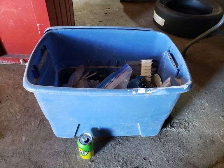 A large bin containing a variety of electrical items, including switches, outlet covers, light fixtures, dimmer components, and more. Some items are in original packaging.