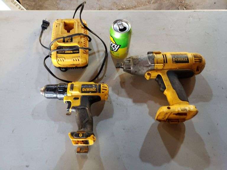 A DeWalt DCD710 cordless drill/driver, a DW059 impact wrench, and a compatible DeWalt charger. Items feature black and yellow designs with visible model and serial numbers.
