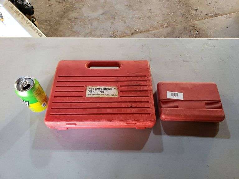 Astro Pneumatic Tool Co. 7860 11-piece disc brake caliper adapter tool set made in Taiwan. Includes an additional case containing various bits. Both sets are stored in red plastic cases.